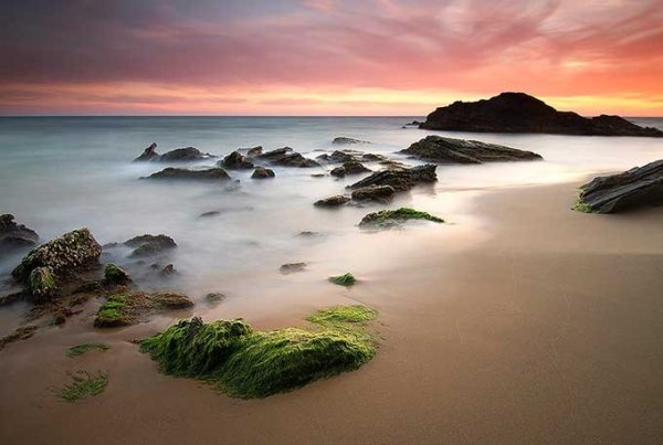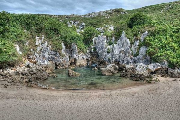 Asztúria az ún. “Zöld Spanyolország” része fent északon, ahol sűrű erdők és dús legelők borítják a tájat. Persze tengerpart itt is van, a képen szereplő pici strand pedig a tenger romboló erejének ékes bizonyítéka. Hajdanán ez egy vízzel barlang volt, de a tenger kimosta a sziklákat körülötte, aminek következtében beomlott. Itt maradt a nyílt tengertől elzárt, mintegy 50 méter széles, kristálytiszta víz, ahol jó megpihenni egy-egy kirándulás során. A tengerrel egyébként ma is szoros kapcsolatot ápol ez a kis tavacska, hiszen dagálykor összeérnek.