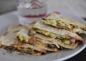 Piríts hagymát és dobj rá szeletekre vágott gombát. 5-6 percig süsd össze. Közben szeletelj fel 10 dkg csirkesonkát. Egy tortilla lapra reszelj sajtot, szórj rá a sonkából és a gombából, majd jön egy újabb réteg reszelt sajt és még egy tortilla lap a tetejére. Tedd sütőbe és süsd össze, hogy a sajt megolvadjon és a felső tortilla kicsit megpiruljon. Négyfelé vágva tálald. Isteni hétvégi reggeli!